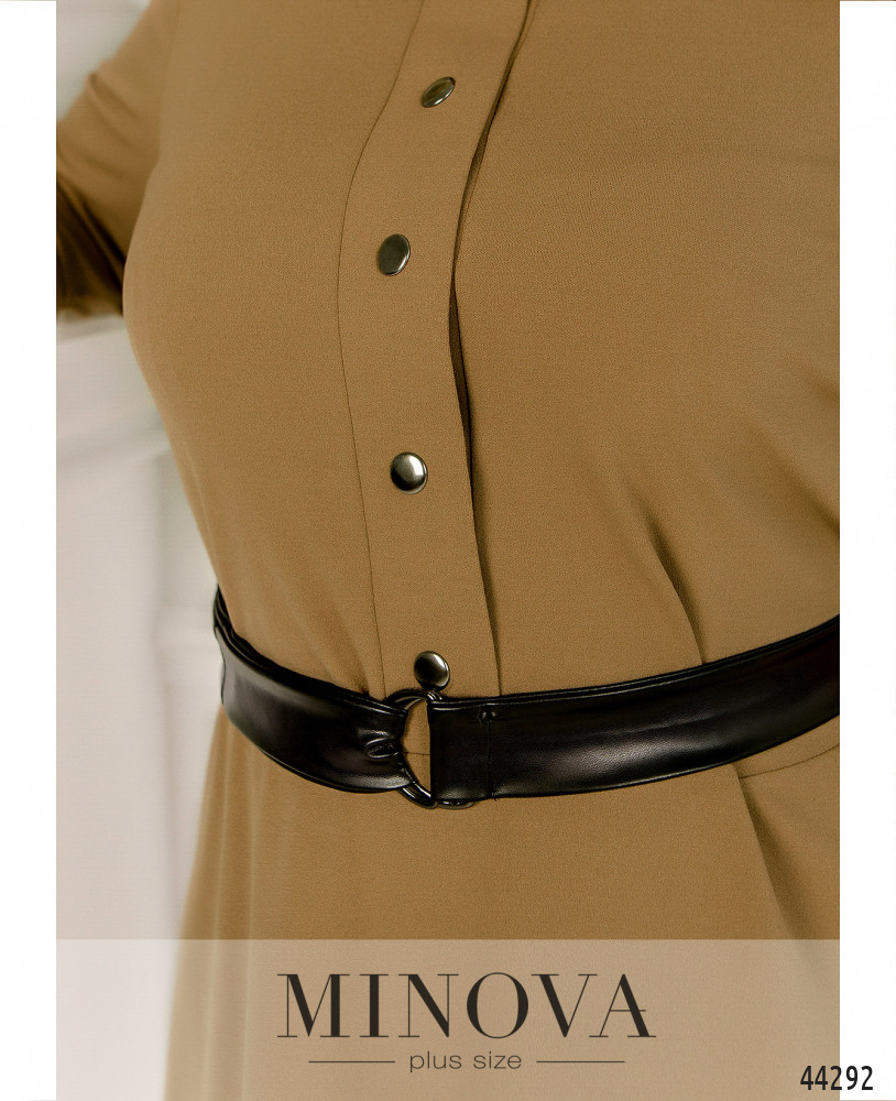Минималистичное платье батал без застёжек и карманов, кнопки спереди на планке декоративные. Рукава с мягкими манжетами, на манжетах по две декоративных кнопки, на груди вытачки. Подол отрезной. Вырез горловины полукруглый.