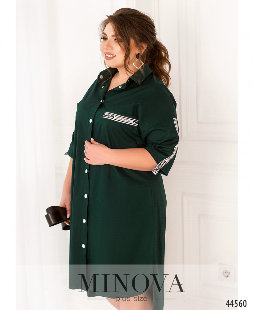 Стильное платье батал в стиле рубашки: отложной воротничок, ряд кнопок спереди на планке. На груди накладной карман. Карман и рукава, а также отрезной по спинке подол украшены декоративной лентой. Подол по спинке расходится от оборки по центру. По бокам подола - небольшие скруглённые разрезы. Карманов по бокам нет.
