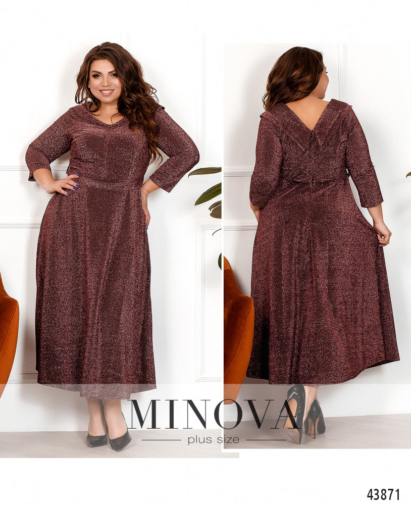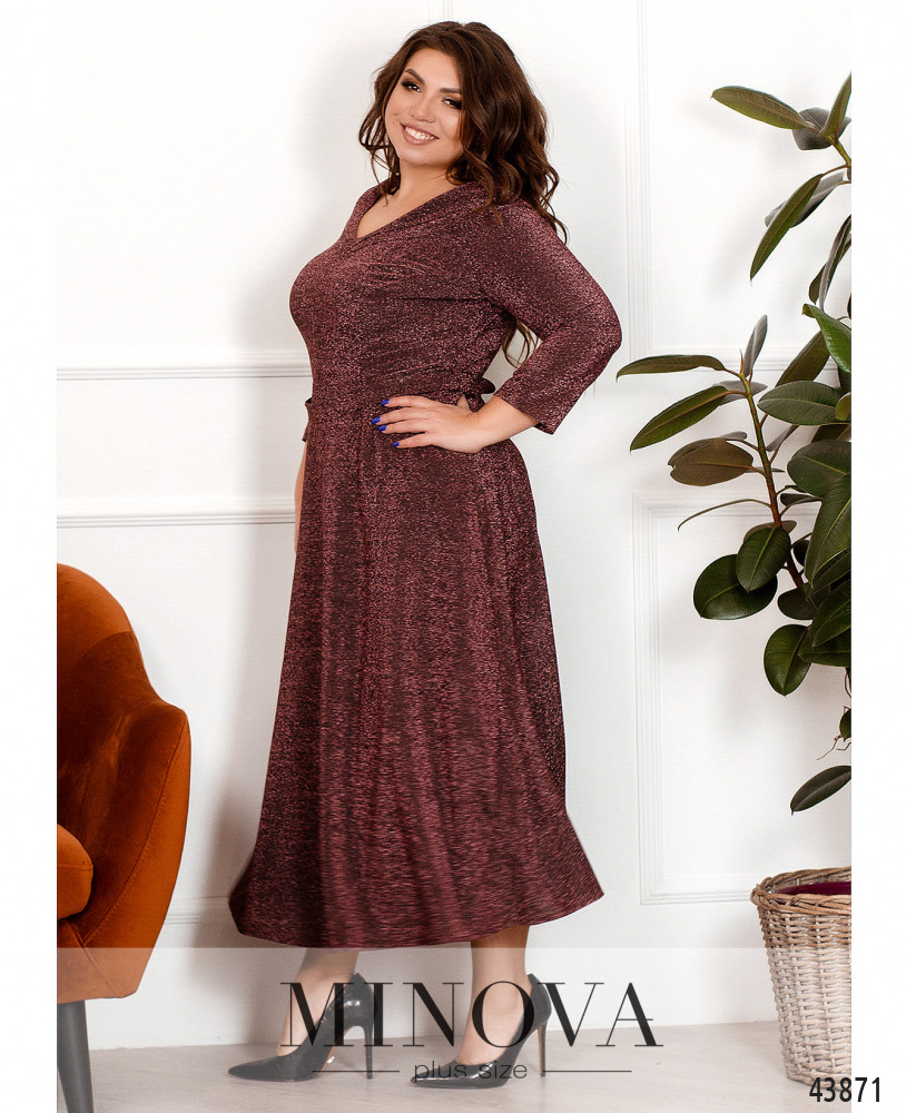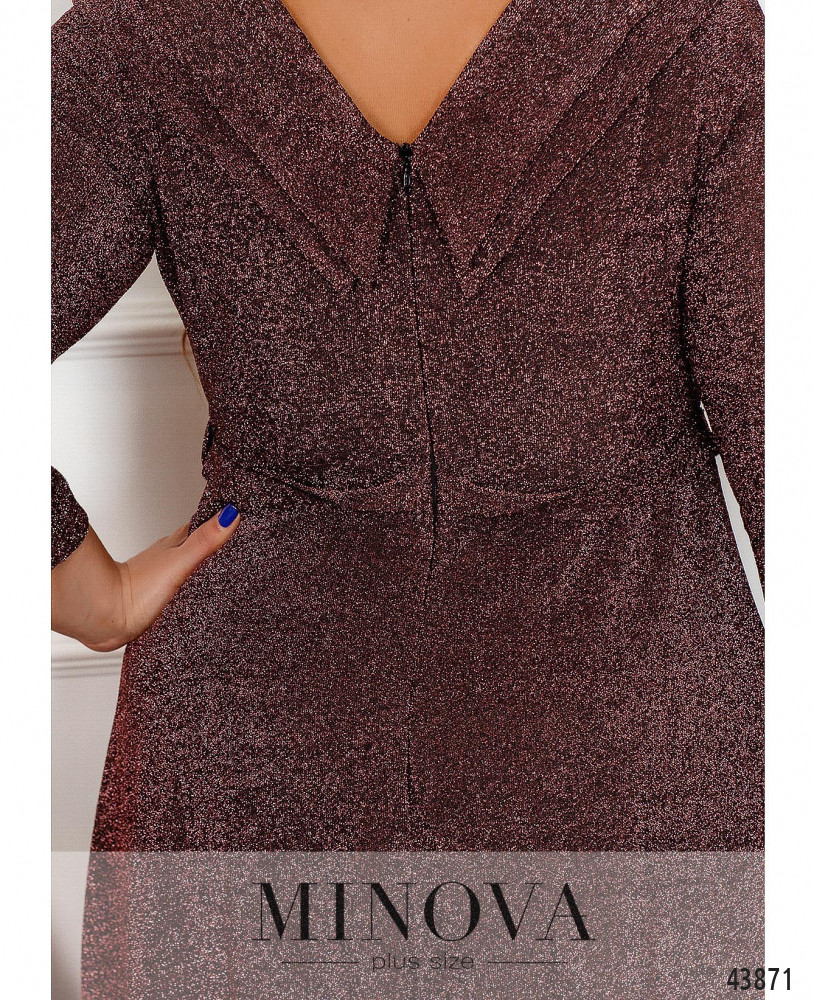 Нарядное платье приталенного силуэта с V-образным вырезом спереди и по спине. На талии подшит поясок. Змейка вшита по спинке, карманов нет. Ткань украшена люрексом. Рукава без манжет. Спереди на груди продольные вытачки.