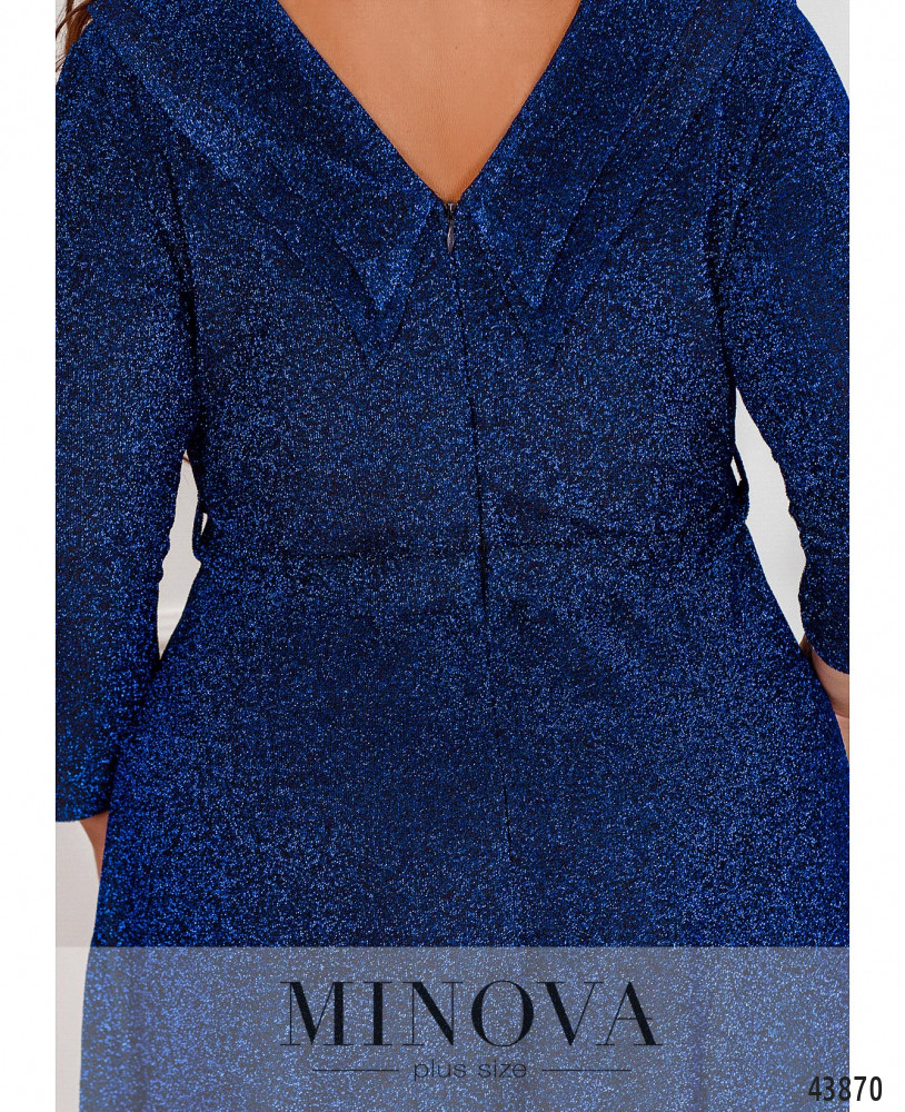 Нарядное платье приталенного силуэта с V-образным вырезом спереди и по спине. На талии подшит поясок. Змейка вшита по спинке, карманов нет. Ткань украшена люрексом. Рукава без манжет. Спереди на груди продольные вытачки.