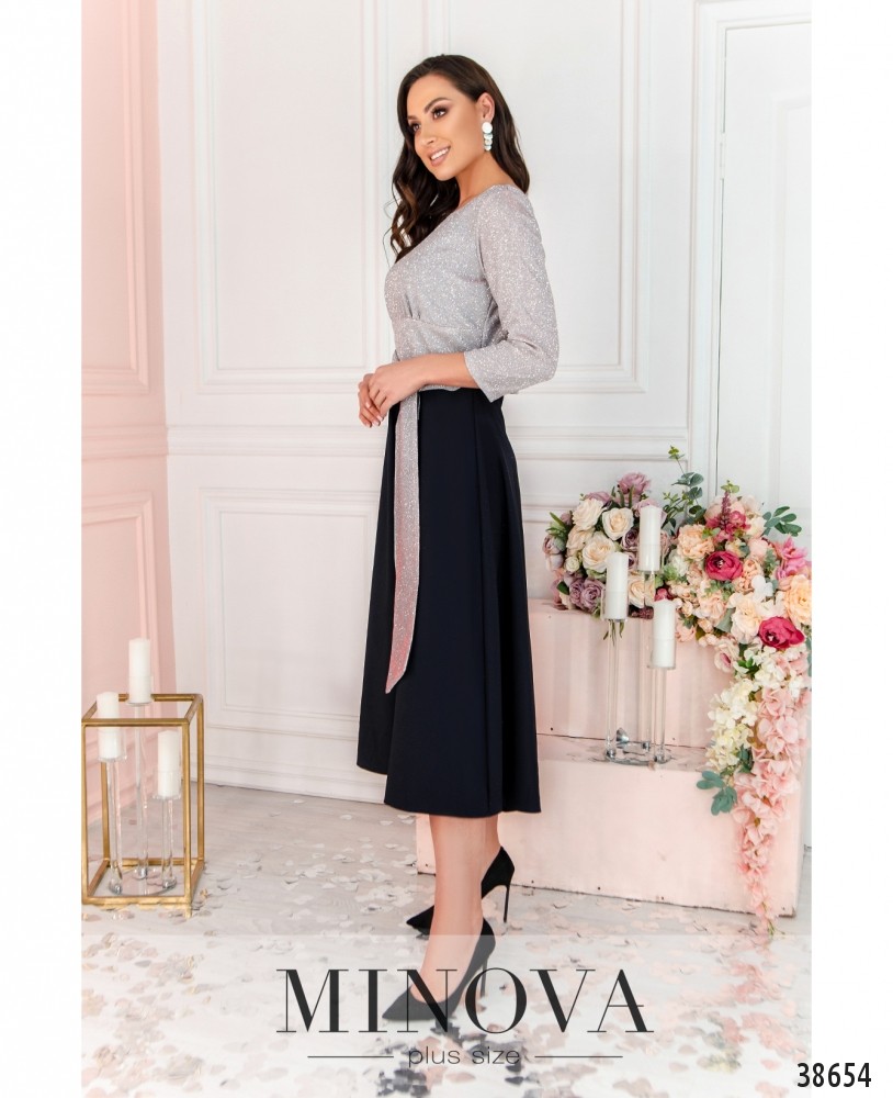 Нарядное вечернее платье батал с однотонным гладким подолом и блестящим верхом, с блёстками и люрексом. Застёгивается на молнию, вшитую по спинке от уровня талии. Завязывается на запАх, пояс пропускается через прорези по бокам. Ткань изнутри гладкая. Карманов нет.