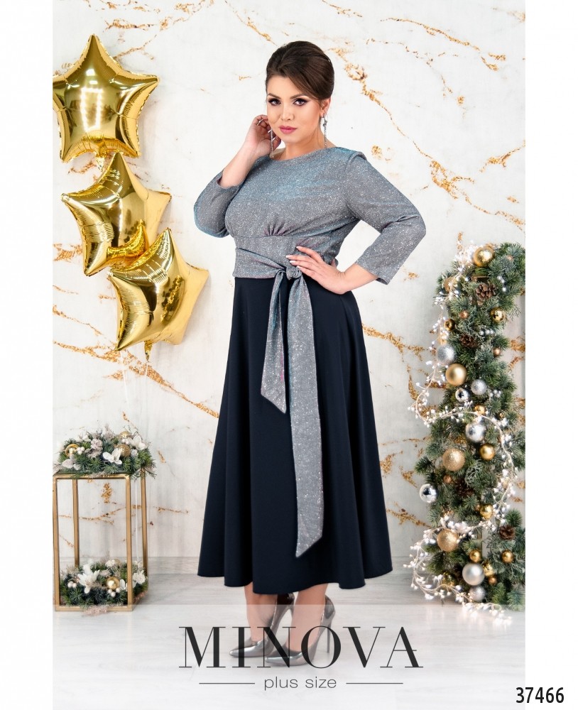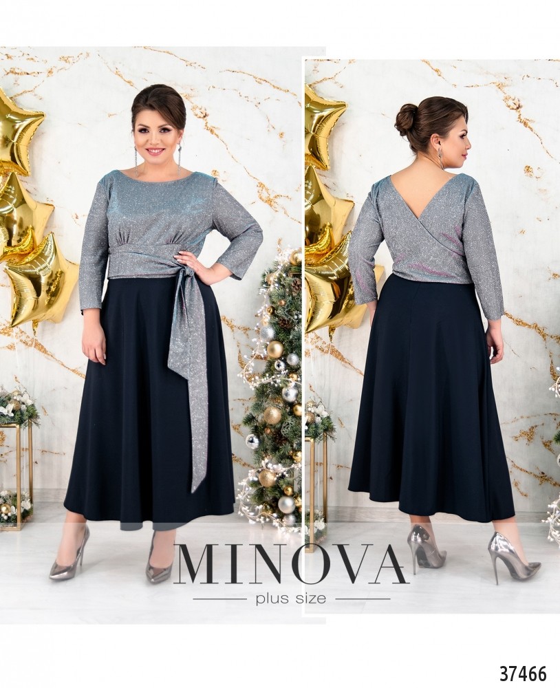 Элегантное вечернее платье батал с лифом на запАх, украшенным люрексом, глубоким декольте и длинным подолом. Карманов на платье нет. Рукава без манжет.