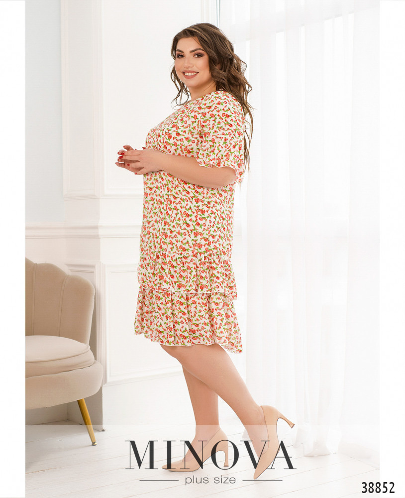Оригинальное платье батал с расклешёнными рукавами, с мягкой подкладкой и полупрозрачным верхним слоем. Застёжка - пуговка сзади под шеей. Вырез горловины полукруглый, карманов нет. Подол украшен двумя рядами мягких оборок.