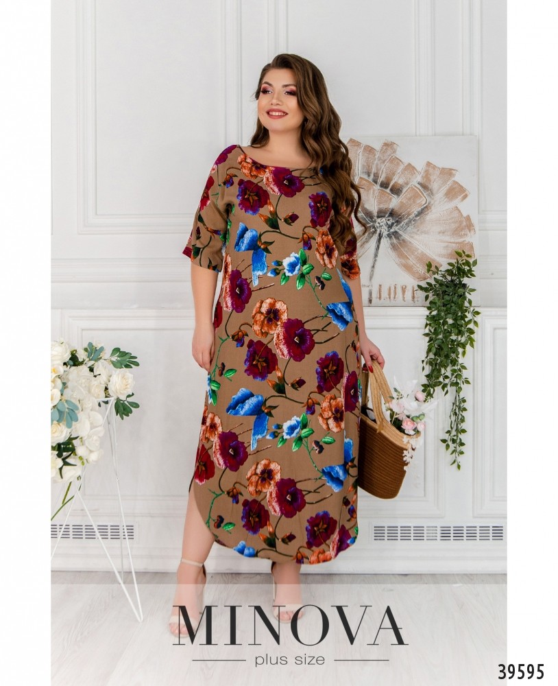 Радостное летнее платье большого размера с вырезом горловины "лодочка", крой свободный, по бокам - врезные карманы, застёжек нет, рукава без манжет.