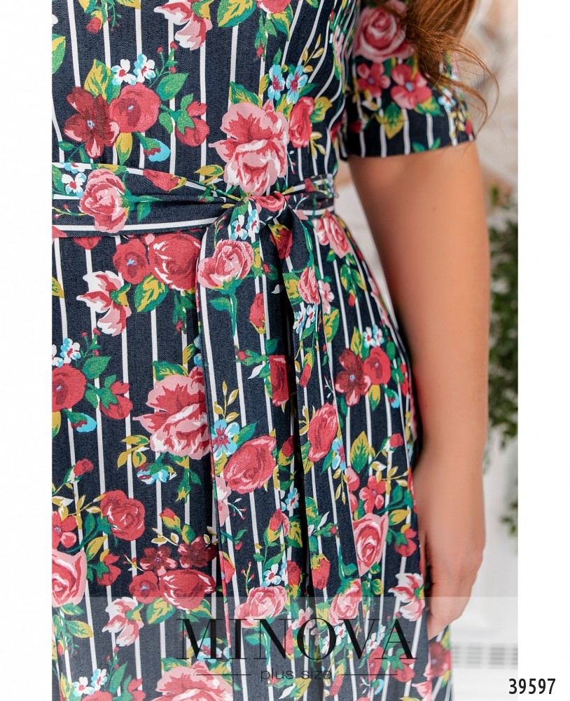 Нежное платье батал с приятным, привлекательным принтом. Подол подшит к верху, ниспадает мягкими оборками и подчёркивает талию. Рукава без манжет, на груди вытачки, застёжка - вшитая по спинке молния, карманов нет. В комплекте - тканевой пояс в тон принту.