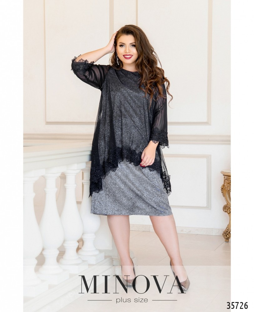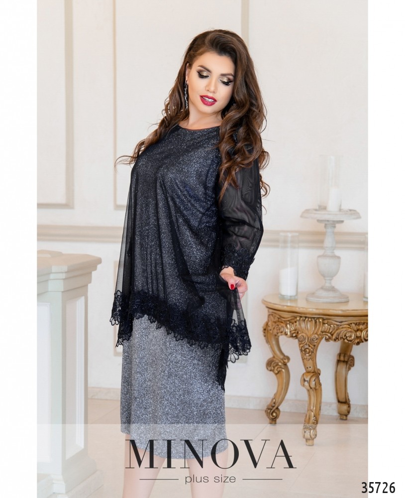 Очень стильное благодаря своей минималистичности платье батал от Minova прекрасно тем, что вы его можете дополнить любыми подходящими к случаю аксессуарами, ведь его тёмная однотонная расцветка отлично сочетается с другими оттенками! Платье двуслойное, нижний слой мягкий, приятный к телу, свободного кроя. Снизу рукавов нет. Верхняя часть – накидка, из полупрозрачного материала, украшена небольшим кружевом по подолу, подол асимметричный. Застёжек и карманов нет, вырез горловины достаточно широкий, неглубокий. Будет хорошо смотреться на любой фигуре, даже «прямоугольной», и лучше всего сочетается с классической обувью.