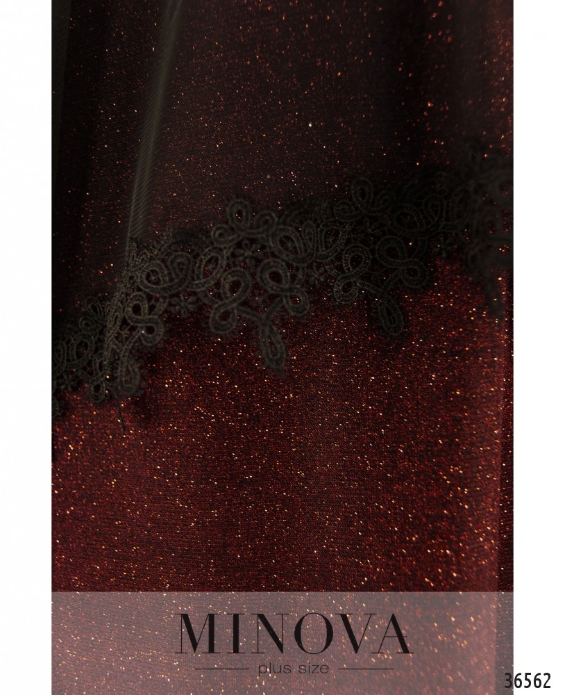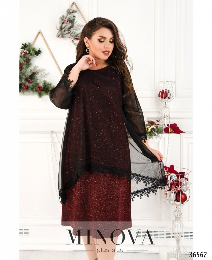 Двуслойные платья всегда выглядят так симпатично! Minova представляет в новом каталоге модель платья батал из блестящей красной ткани с нитями люрекса, изнутри ткань гладкая. Накидка – из полупрозрачной контрастной сеточки, ниспадающей мягкими складками. Сеточка снизу украшена ажурным кружевом. Рукава полной длины, полностью выполнены из сеточки и также декорированы кружевом. На груди на подкладке – небольшие вытачки. Карманы и застёжки отсутствуют. Платье длины миди, поэтому рекомендуем обувь на каблуке или танкетке.
