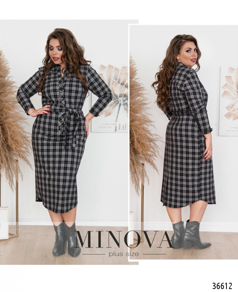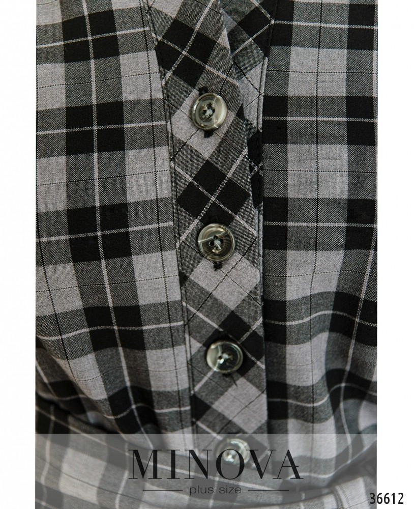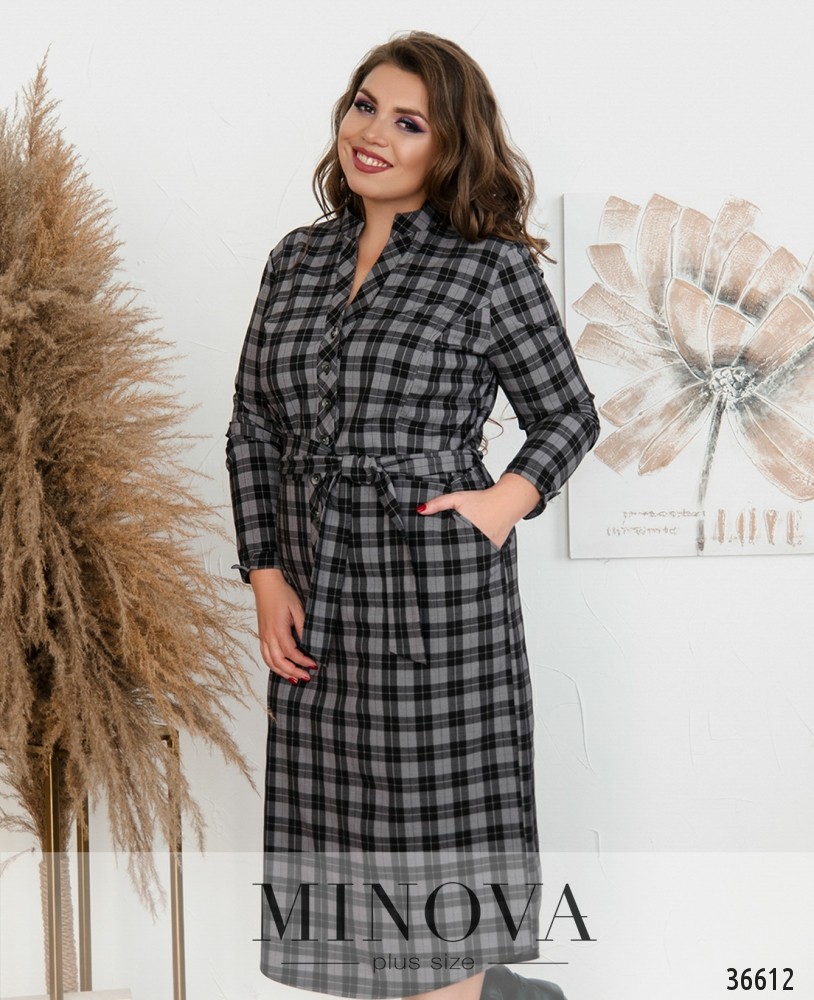 Универсальное повседневное платье батал из коллекции Minova – в крупную ахроматическую клетку, которая делает его более нарядным. Платье из мягкой ткани, с рукавами полной длины. На рукавах небольшие манжеты без пуговиц, по бокам манжет – маленький разрез. В платье есть врезные карманы слева и справа. Застёжка – ряд пуговиц от воротничка до уровня ниже талии. Крой свободный, прямой,но в комплекте прилагается пояс, так что вы можете приталить силуэт. С таким платьем можно сочетать и спортивную, и городскую обувь, и туфли на каблуке или танкетке.