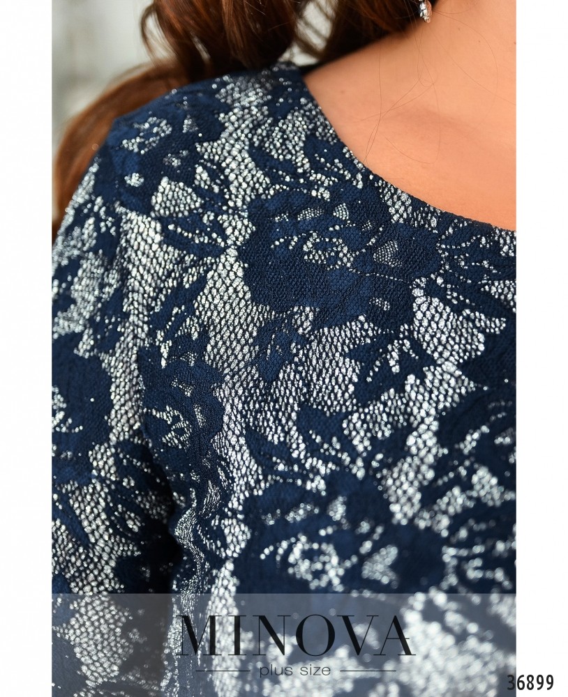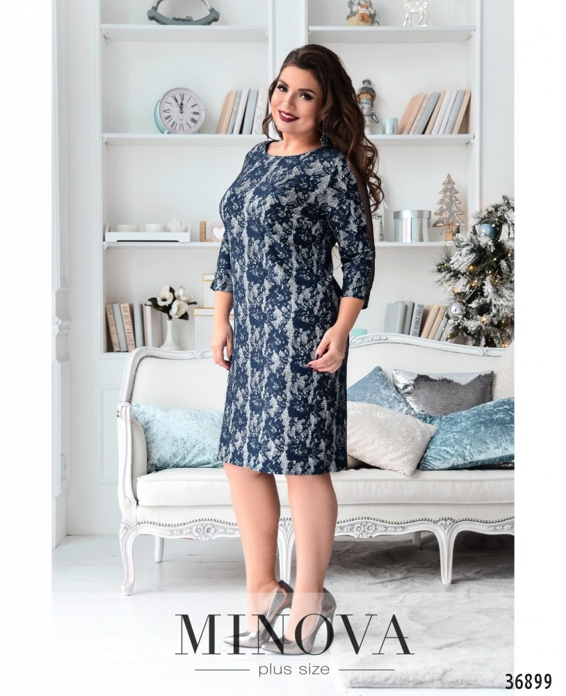Женственное и романтичное приталенное платье батал из свежего пополнения каталога женской одежды больших размеров от Minova. Платье не длинное, очень стильное и аккуратное. Снизу – гладкая подкладка, сверху подшита сеточка с люрексом и кружевом. На груди – небольшие вытачки, рукава длиной ¾, без манжет, сверху подшита сеточка в виде лацканов от плеча до запястья. Карманы отсутствуют. Вырез горловины широкий, полукруглый, застёжка – вшитая по спинке змейка. Платье прекрасно дополнит ваш праздничный гардероб, особенно в сочетании с нарядной обувью.