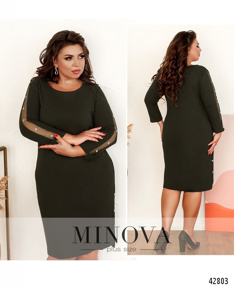 Оригинальное платье плюс сайз без застёжек и карманов. Рукава украшены сеточкой в виде лампасов. На груди вытачки. На подоле по бокам нашиты декоративные пуговицы. Вырез горловины полукруглый.