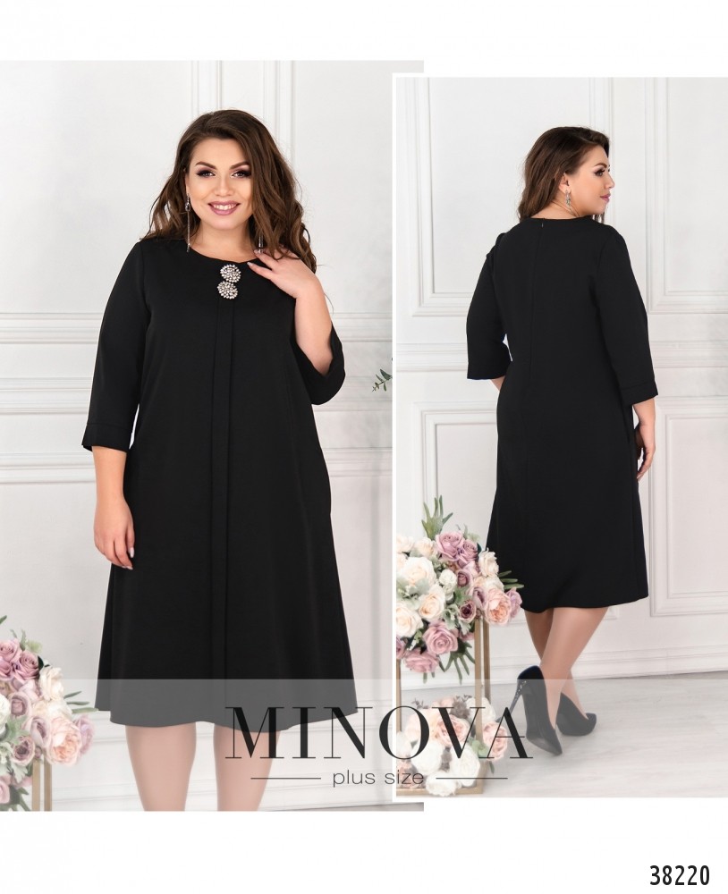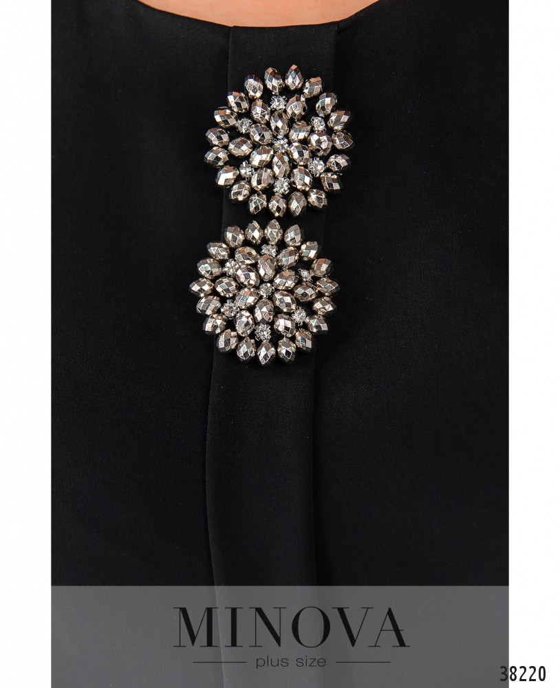 Строгое и нарядное платье свободного кроя. Вырез горловины полукруглый, под вырезом – две нежных пришитых броши на декоративной планке, которая расположена от горловины до подола. По бокам – врезные карманы, застёгивается на вшитую по спинке молнию, рукава с мягкими манжетами, на манжетах небольшие разрезы.