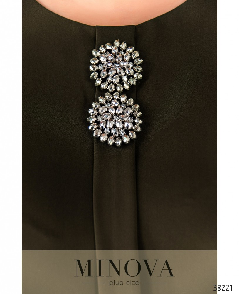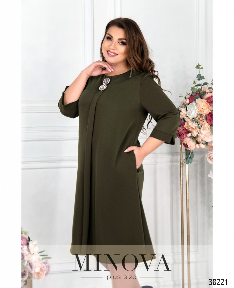 Строгое и нарядное платье свободного кроя. Вырез горловины полукруглый, под вырезом – две нежных пришитых броши на декоративной планке, которая расположена от горловины до подола. По бокам – врезные карманы, застёгивается на вшитую по спинке молнию, рукава с мягкими манжетами, на манжетах небольшие разрезы.