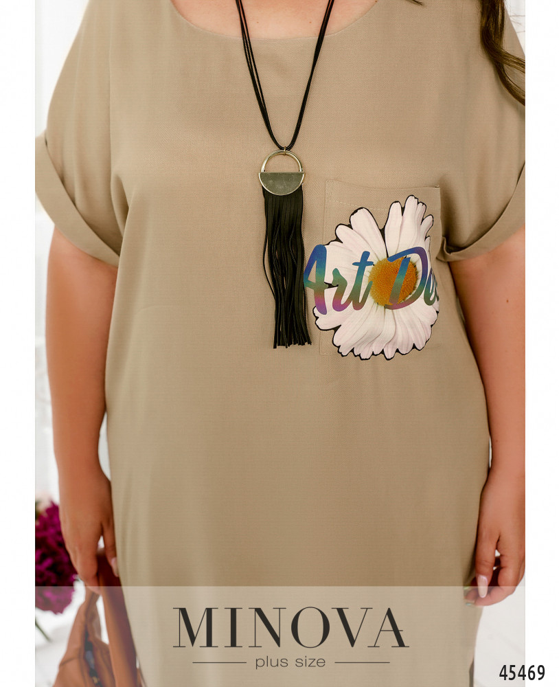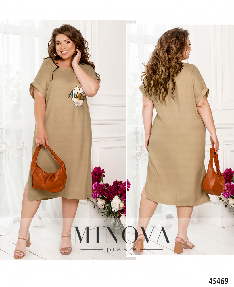 Универсальное женственное платье прямого кроя удачно впишется в любой стиль. Данная модель дополнена короткими рукавами с приспущенной линией плеча и отворотами, а также декоративным принтом на груди и разрезами по бокам, кокетливо приоткрывающими ваши ножки.