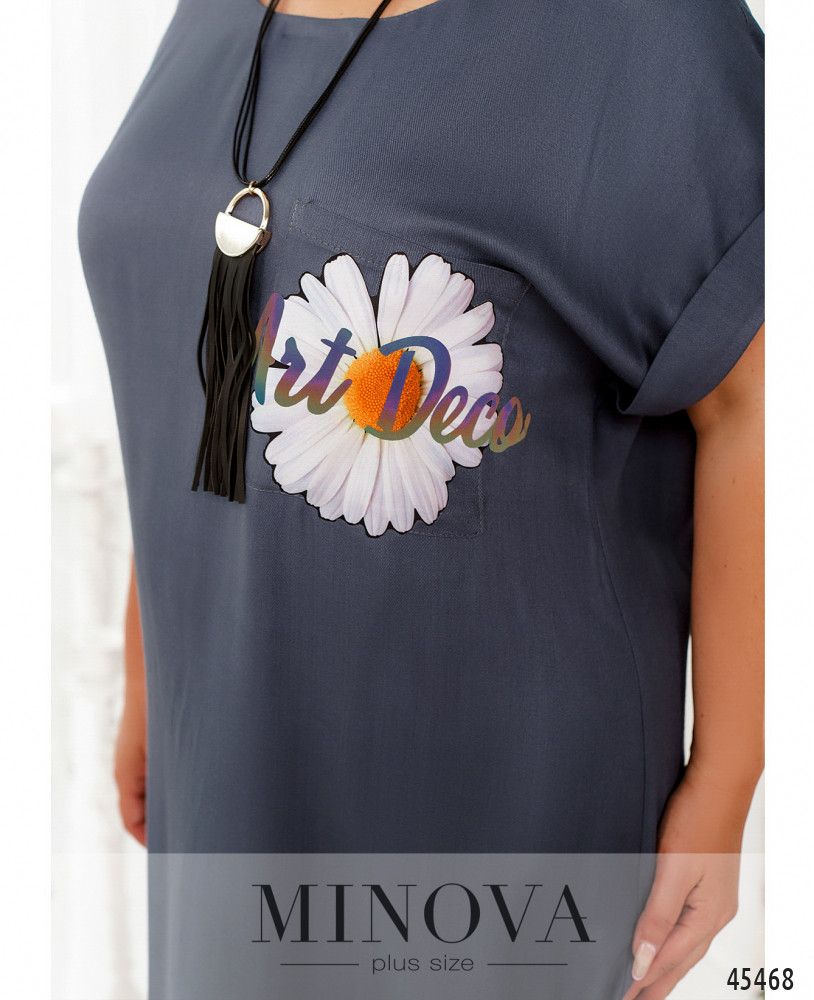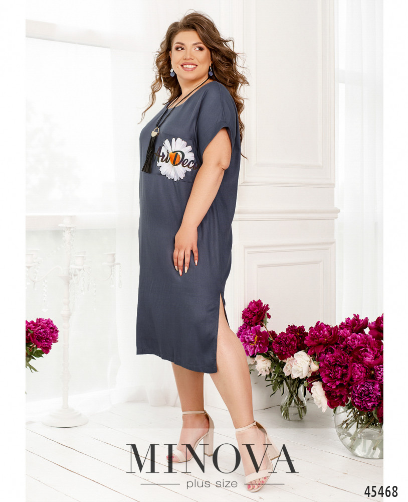 Универсальное женственное платье прямого кроя удачно впишется в любой стиль. Данная модель дополнена короткими рукавами с приспущенной линией плеча и отворотами, а также декоративным принтом на груди и разрезами по бокам, кокетливо приоткрывающими ваши ножки.
