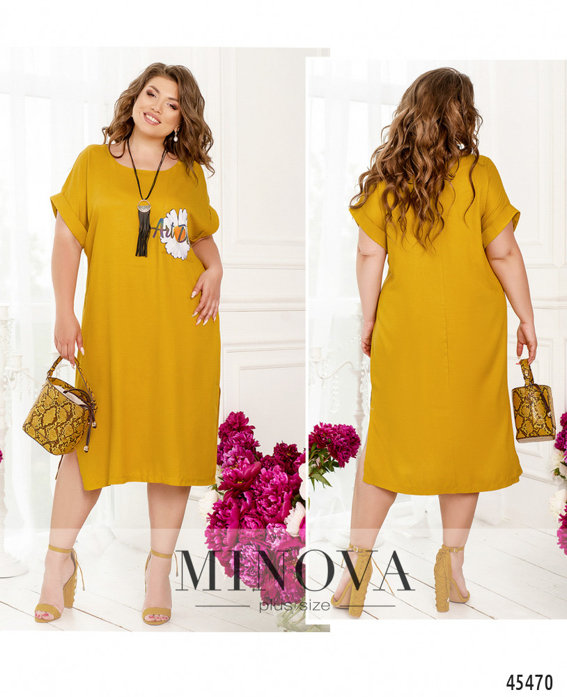 Универсальное женственное платье прямого кроя удачно впишется в любой стиль. Данная модель дополнена короткими рукавами с приспущенной линией плеча и отворотами, а также декоративным принтом на груди и разрезами по бокам, кокетливо приоткрывающими ваши ножки.