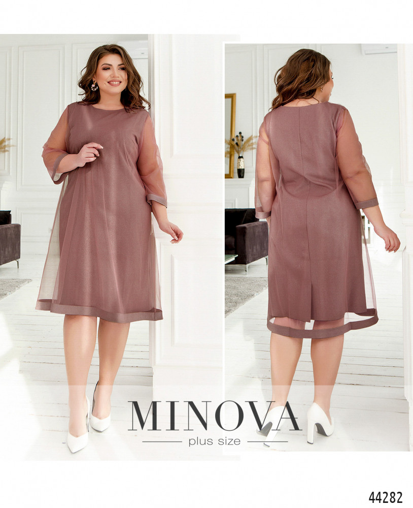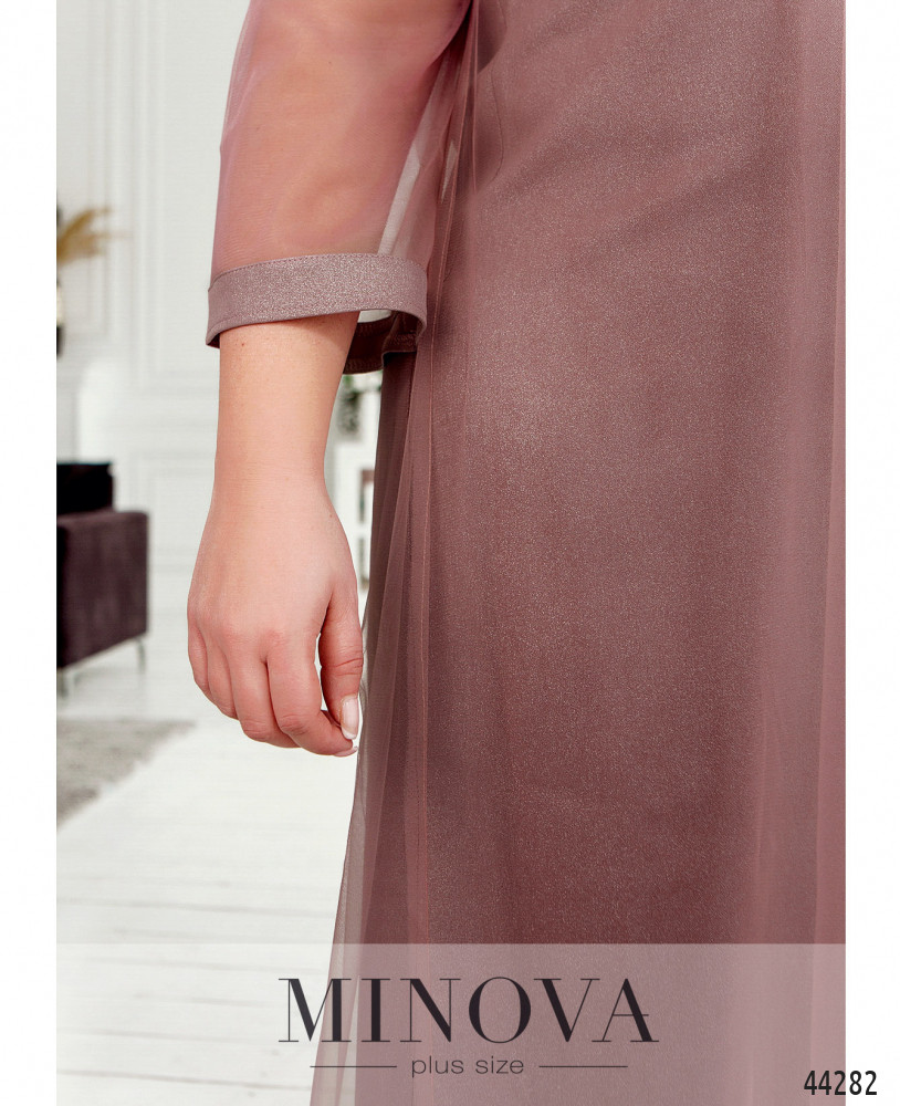 Нежное и воздушное платье батал с плотным нижним слоем и полупрозрачной верхней тканью. Рукава без подкладки, с плотными манжетами. Нижняя ткань с люрексом. На груди вытачки. Вырез горловины полукруглый. Застёжек и карманов нет.