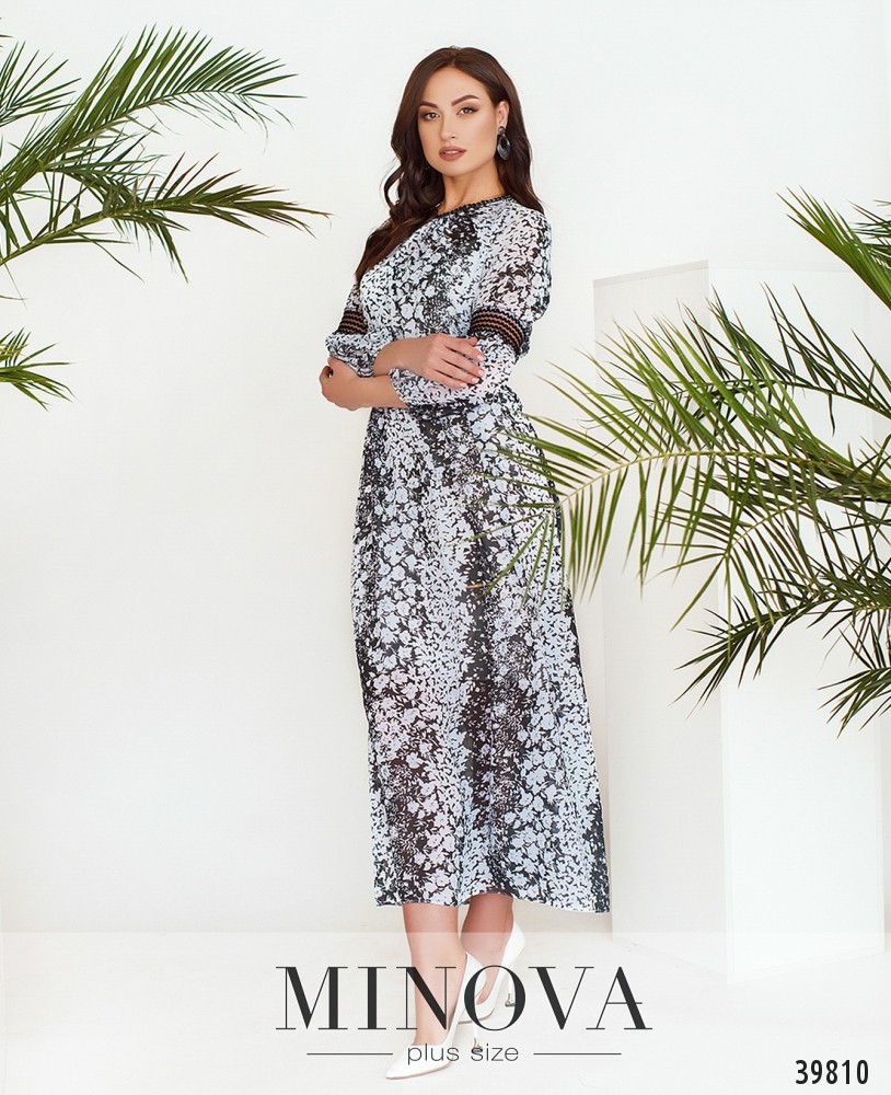 Оригинальное и очень привлекательное платье батал с рукавом фасона "рукав амазонки", присобранным в два буфа поперечной тесьмой. Карманов нет, застёжка - пуговка сзади на шее. Платье двуслойное: верхний слой полупрозрачный с узором, нижняя ткань мягкая, гладкая. В манжет и в пояс вшиты резинки.