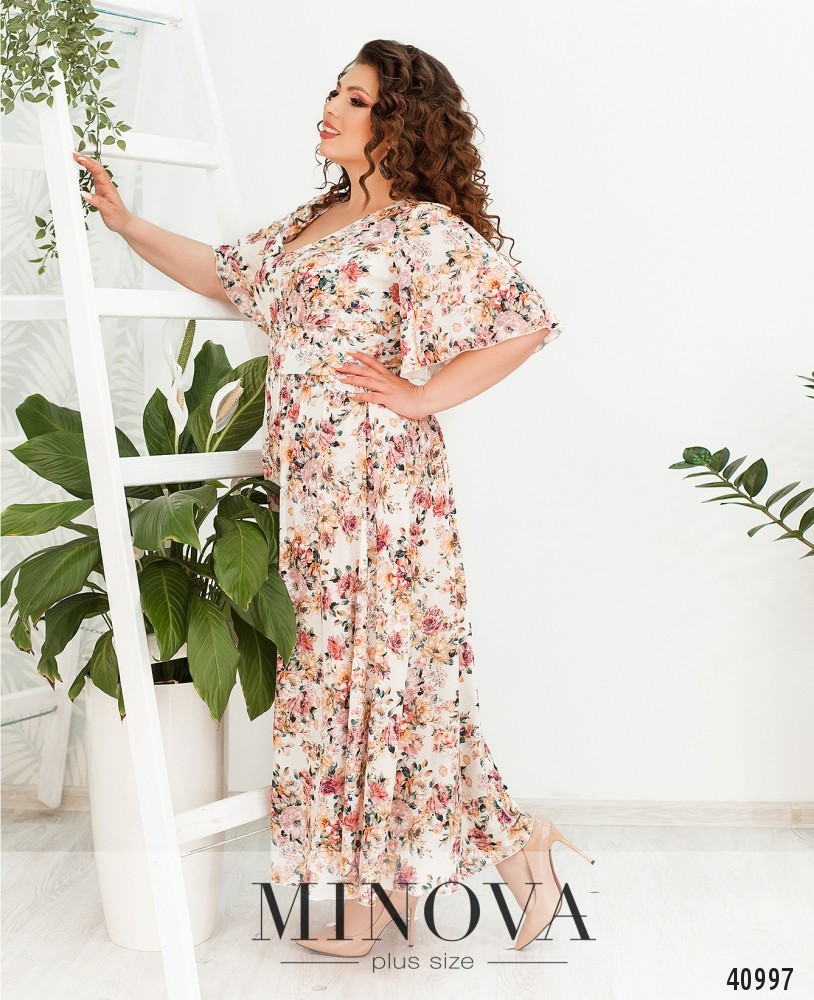 Яркое, нежное и женственное платье батал с подолом, присобранным мягкими оборками и отделённым от верха широкой полосой. Застёжка - вшитая по спинке потайная молния, карманов нет. Вырез горловины V-образный, рукава свободные, без манжет.