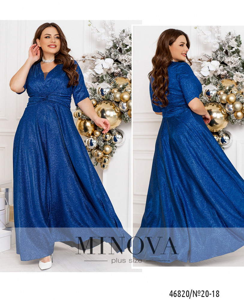 Романтичное платье большого размера с глубоким декольте. Застёгивается на молнию, вшитую по спинке. Рукава и основная часть - с мягкой подкладкой и полупрозрачным верхним слоем. Карманов нет.