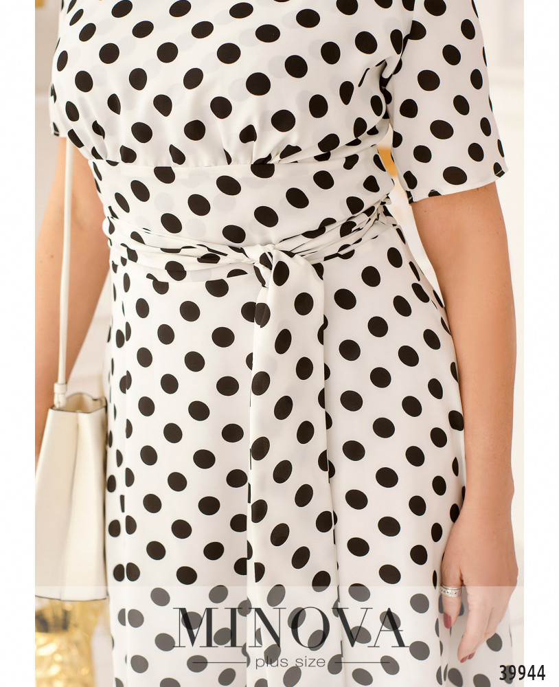 Платье миди на запах с короткими рукавами и расклешенным подолом. На спинке платье запахивается внахлест,а длинный пояс продевается через отверстие и завязывается в бант на лицевой стороне. Отрезной на спинке подол застегивается на скрытую молнию.