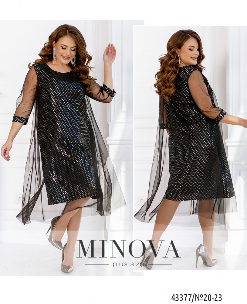 Элегантное платье батал с блёстками, трёхслойное. Нижний слой мягкий, без декора; средний - с блёстками, верхний - полупрозрачный. Плечи декорированы, без сеточки. Рукава полупрозрачные, с плотными манжетами, украшенными декором. Застёжек и карманов нет.