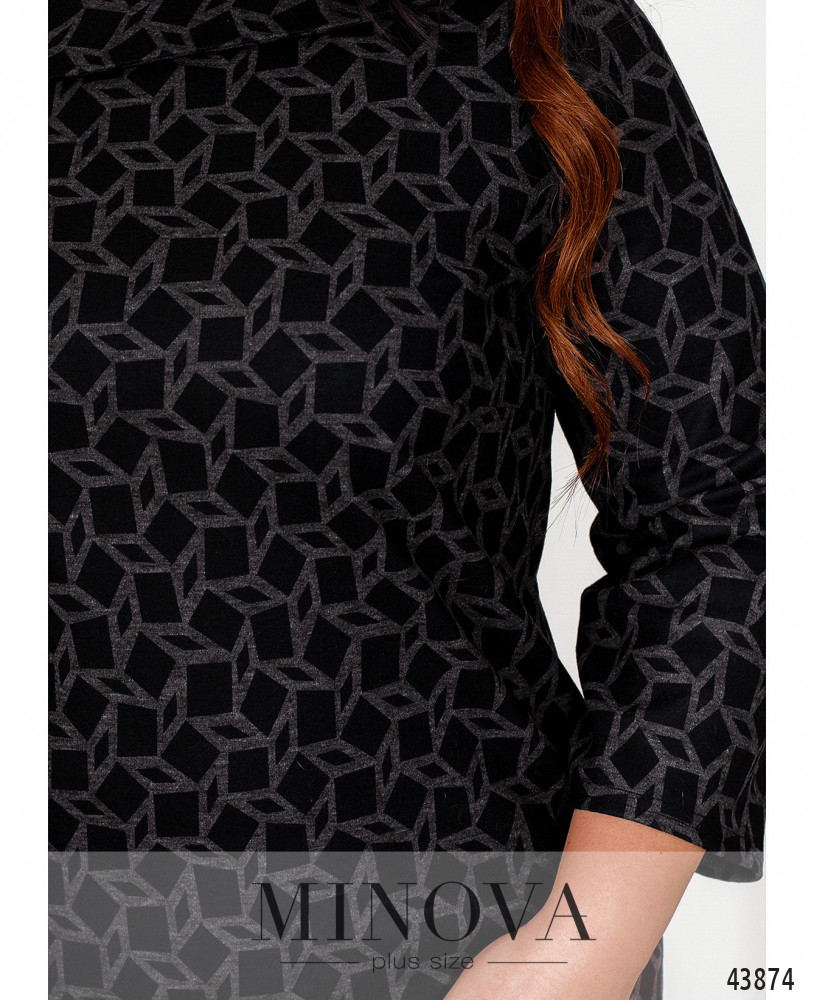 Элегантное платье батал с отложным асимметричным воротничком, рукава без манжет, на груди вытачки. Застёжек и карманов нет.