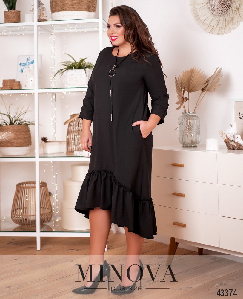 Стильное платье большого размера с оборками на подоле, рукава на запястьях присобраны. Вырез горловины полукруглый, на груди - вытачки. По бокам - врезные карманы. Застёжек нет. Украшение входит в комплект.