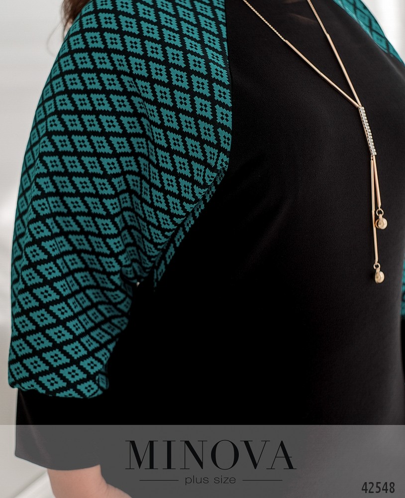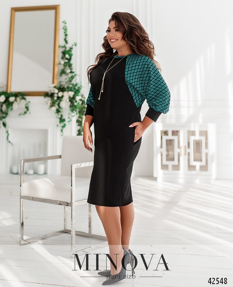 Оригинальное платье батал с контрастными рукавами и горловиной. На рукавах - мягкие манжеты без пуговиц. Застёжек нет, по бокам - врезные карманы.