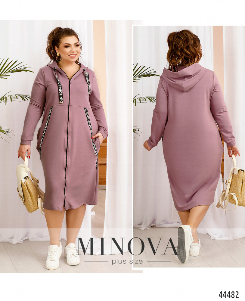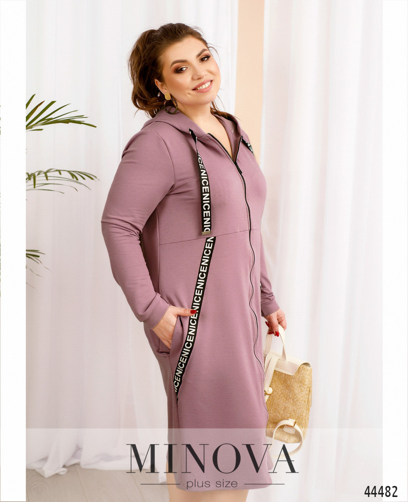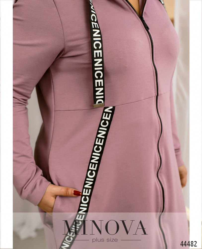 Стильное и удобное платье батал с яркими лентами, пропущенными через капюшон и украшающими платье по диагонали. Ленты на капюшоне с металлическими наконечниками. По бокам - карманы в шве, подкладки нет, рукава с мягкими манжетами. Застёжка - сквозная молния во всю длину.