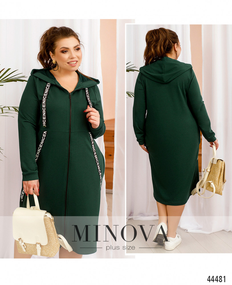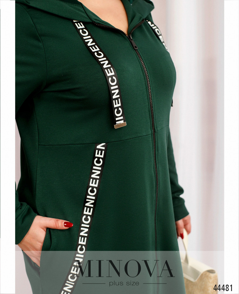 Стильное и удобное платье батал с яркими лентами, пропущенными через капюшон и украшающими платье по диагонали. Ленты на капюшоне с металлическими наконечниками. По бокам - карманы в шве, подкладки нет, рукава с мягкими манжетами. Застёжка - сквозная молния во всю длину.