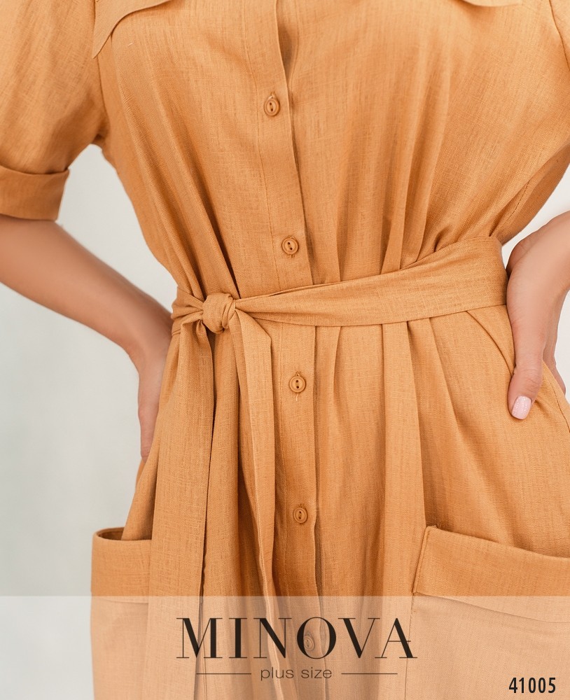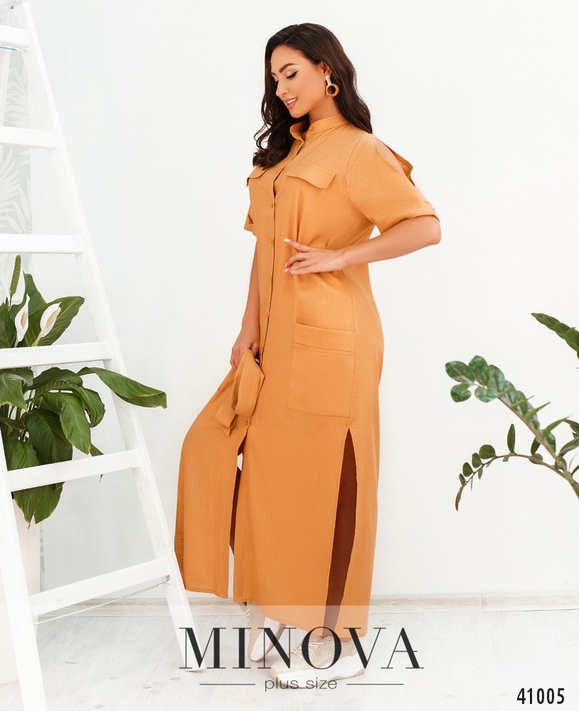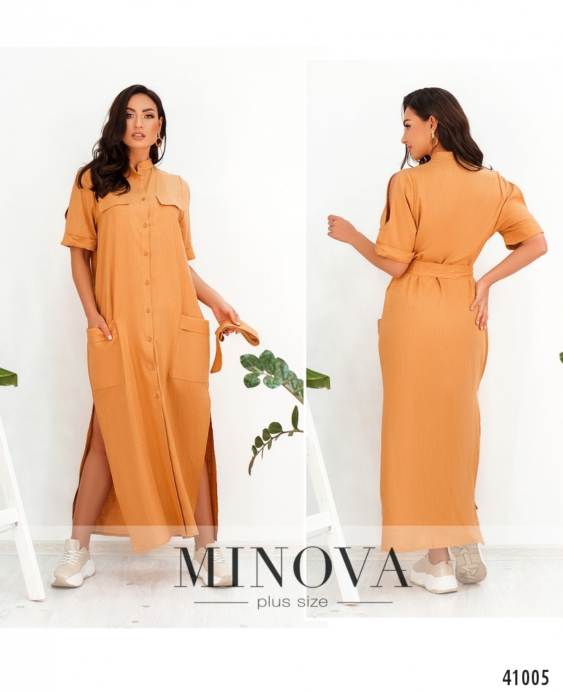 Лёгкое минималистичное платье в пастельных оттенках, большого размера. На груди - декоративные клапаны, на бёдрах - накладные карманы. Рукава с разрезом, цельными манжетами и регулировочной лентой. По бокам подола - небольшие разрезы. Воротничок небольшой. Застёгивается на ряд пуговиц на планке. В комплекте - пояс в тон.