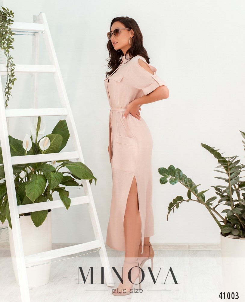 Лёгкое минималистичное платье в пастельных оттенках, большого размера. На груди - декоративные клапаны, на бёдрах - накладные карманы. Рукава с разрезом, цельными манжетами и регулировочной лентой. По бокам подола - небольшие разрезы. Воротничок небольшой. Застёгивается на ряд пуговиц на планке. В комплекте - пояс в тон.