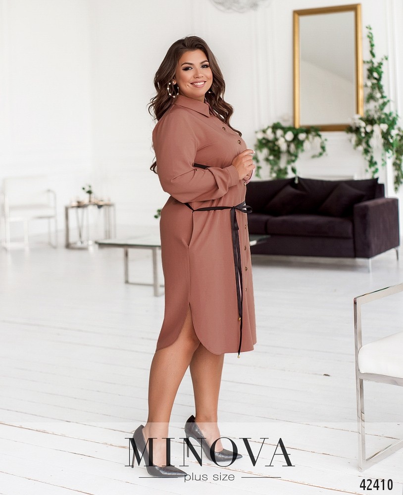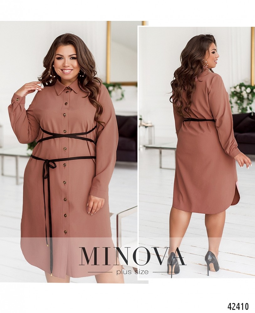Привлекательное платье батал в стиле casual, с отложным воротничком и рядом пуговиц спереди на планке - от воротничка до подола. По бокам - врезные карманы. Рукава с манжетами, на манжетах по одной пуговице. В комплекте длинная лента, подчёркивающая линию талии. На концах ленты - небольшие набалдашники. По бокам подола - разрезы.