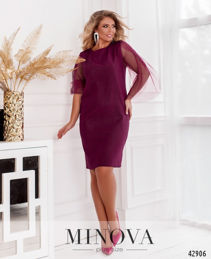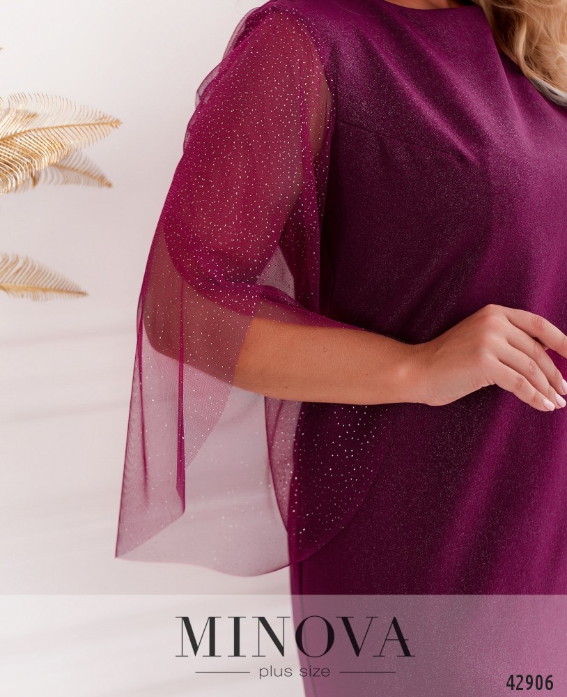 Элегантное платье батал с рукавами "лепесток" на запАх из нежного мерцающего фатина с напылением. Вырез горловины полукруглый, карманов нет. Застёжка - вшитая по спинке молния. Сзади на подоле шлица, на груди вытачки.