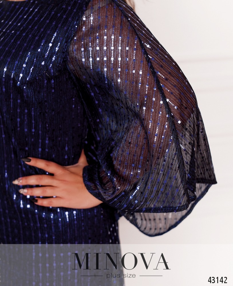 Очаровательное вечернее платье с блестящим декором, рукав фасона "кимоно" - узкий у плеча, расширяющийся к запястьям. Под полупрозрачным верхним слоем - мягкий нижний слой. Застёжка - вшитая по спинке молния. На груди вытачки. Карманов нет.