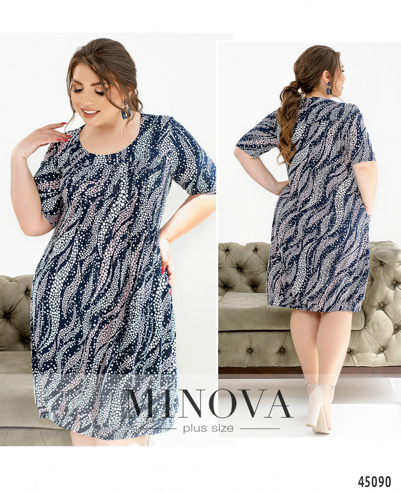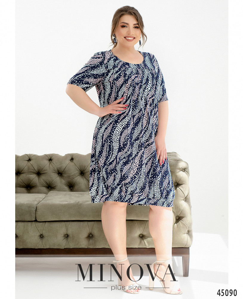 Яркое и привлекательное платье плюс сайз с принтом, рукава недлинные, без манжет. Есть карманы по бокам, расположенные вертикально. Застёжек нет. Ткань от груди присобрана и ниспадает складками. На подоле манжет. Вырез горловины полукруглый.