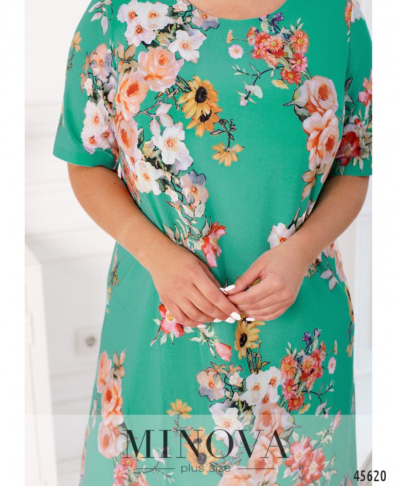 Стильное платье батал с ярким принтом, без застёжек и карманов, рукава без манжет, на груди вытачки. Подол по краям скруглённый. Вырез горловины полукруглый. Пояс НЕ входит в комплект.