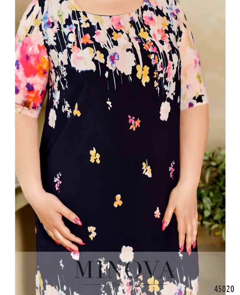 Стильное платье батал с ярким принтом, без застёжек и карманов, рукава без манжет, на груди вытачки. Подол по краям скруглённый. Вырез горловины полукруглый.