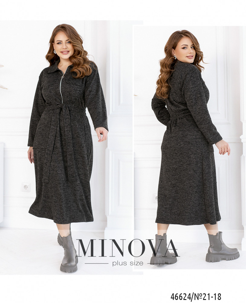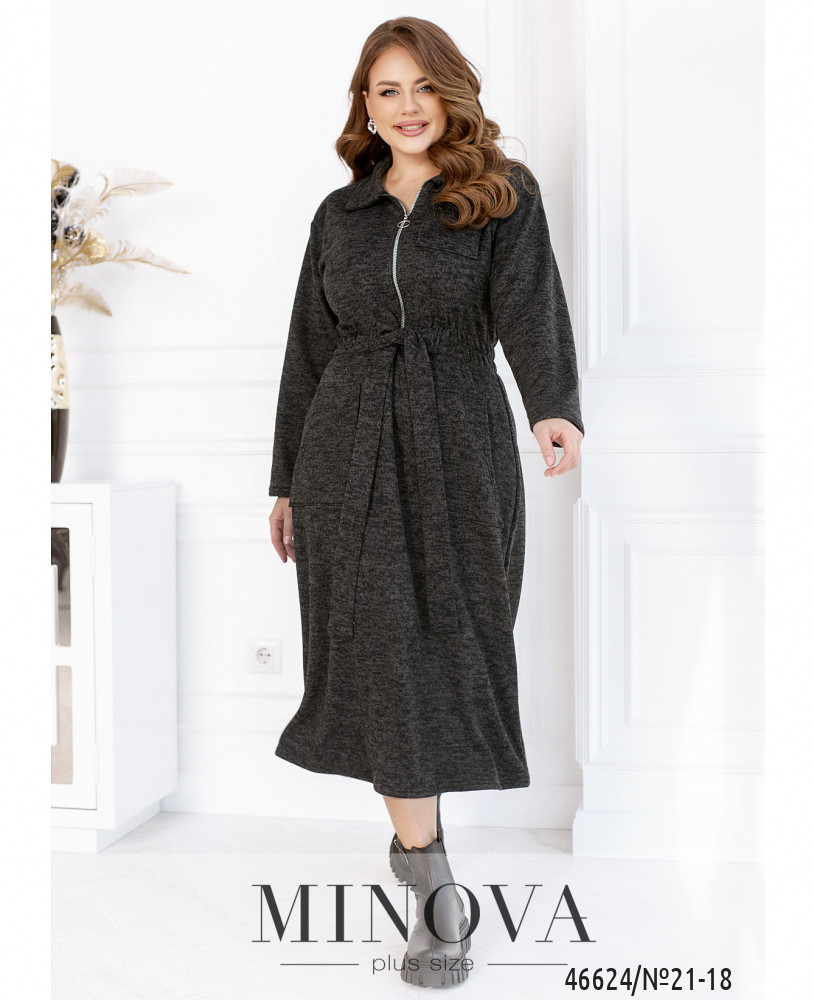 Стильное платье миди может в полной мере подчеркнуть достоинства фигуры и помочь создать женственный и нежный образ. Модель дополнена длинными рукавами с приспущенной линией плеч, небольшим воротником, от которого начинается змейка, вшитая на груди по центру, и накладными карманами на груди и бедрах спереди. Линию талии подчеркивает вшитый в нее пояс и резинка.