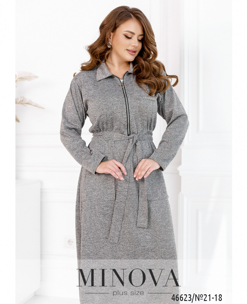 Стильное платье миди может в полной мере подчеркнуть достоинства фигуры и помочь создать женственный и нежный образ. Модель дополнена длинными рукавами с приспущенной линией плеч, небольшим воротником, от которого начинается змейка, вшитая на груди по центру, и накладными карманами на груди и бедрах спереди. Линию талии подчеркивает вшитый в нее пояс и резинка.