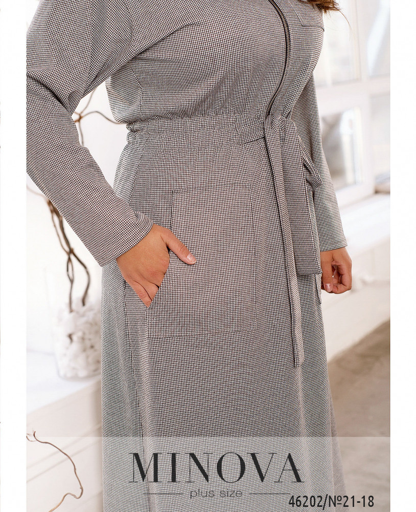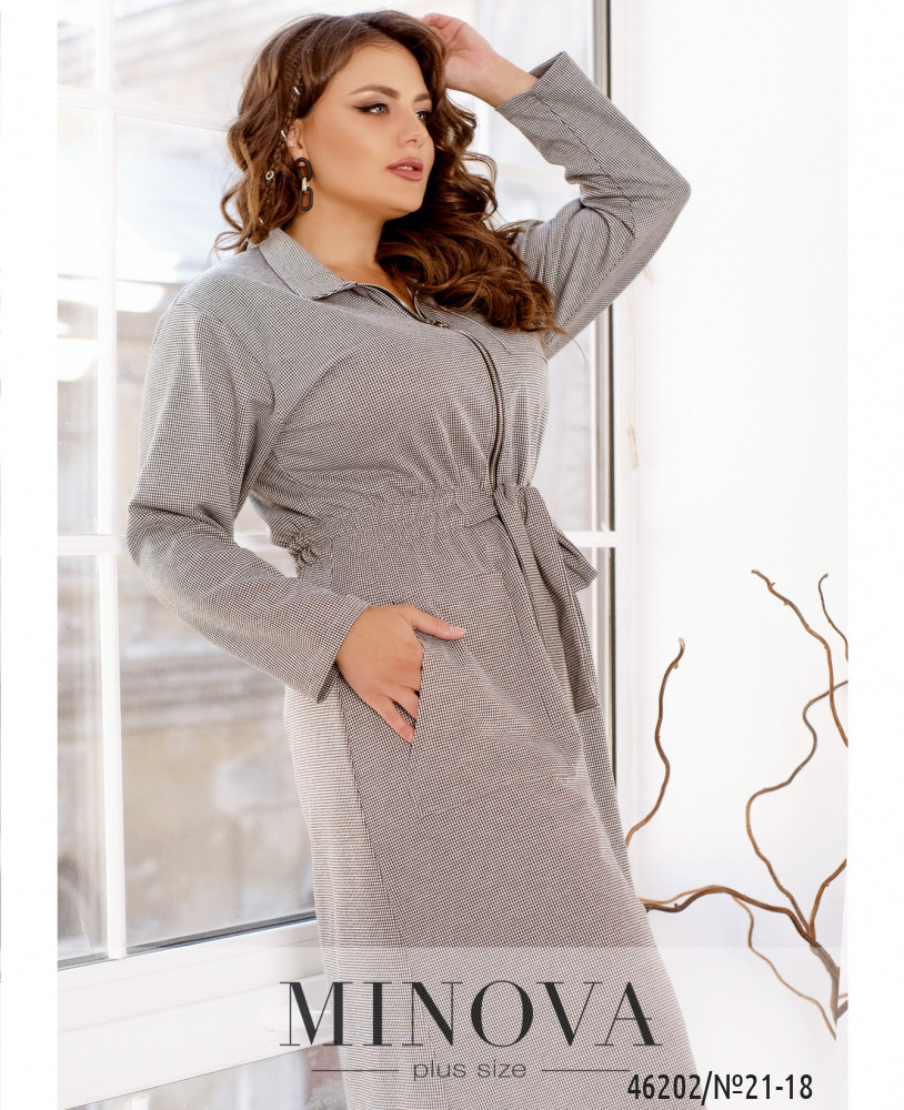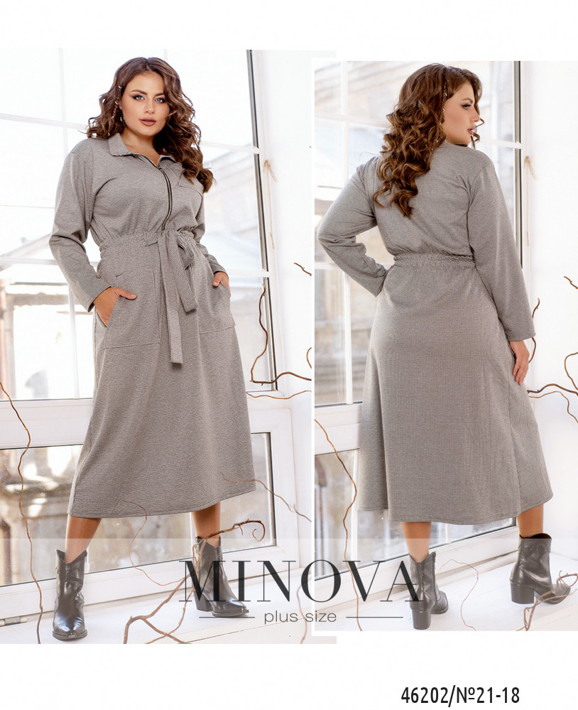 Стильное платье миди может в полной мере подчеркнуть достоинства фигуры и помочь создать женственный и нежный образ. Модель дополнена длинными рукавами с приспущенной линией плеч, небольшим воротником, от которого начинается змейка, вшитая на груди по центру, и накладными карманами на груди и бедрах спереди. Линию талии подчеркивает вшитый в нее пояс и резинка.