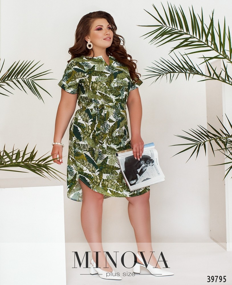 Привлекательное платье большого размера с ярким принтом, без карманов и застёжек, в комплекте - пояс. Рукава с небольшими отворотами. Вырез горловины - неглубокий, V-образный.