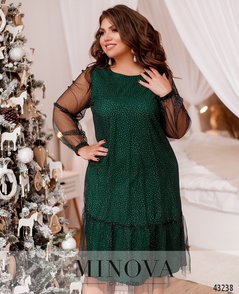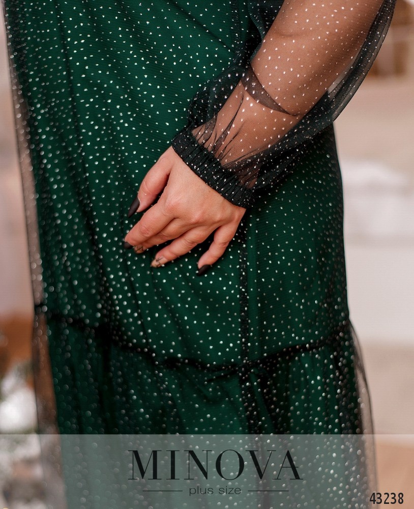 Яркое и романтичное платье батал А-силуэта, без застёжек и карманов. Вырез горловины полукруглый. Верхний слой - полупрозрачный, с блёстками, на подоле - оборки. Нижний слой мягкий, приятный к телу. Рукава без подкладки, на запястьях вшиты резинки. На груди вытачки.