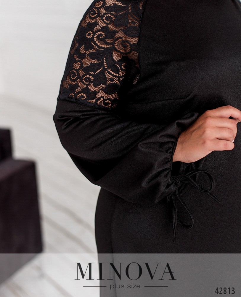 Элегантное платье большого размера с кружевной вставкой на плечах. Рукава сужаются к запястьям, завязываются на тесёмки. На груди вытачки. Застёжка - молния, вшитая по спинке. Карманов нет. Ткань с люрексом, изнутри гладкая.
