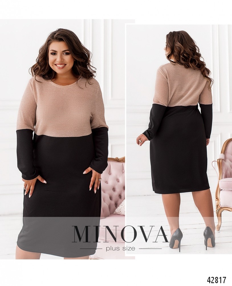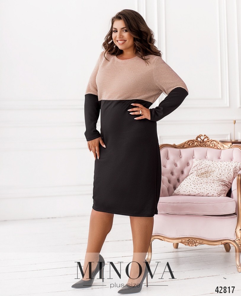 Романтичное платье батал без застёжек и карманов, подол однотонный, рукава в нижней части тоже однотонные, без манжет. Верх с люрексом.
