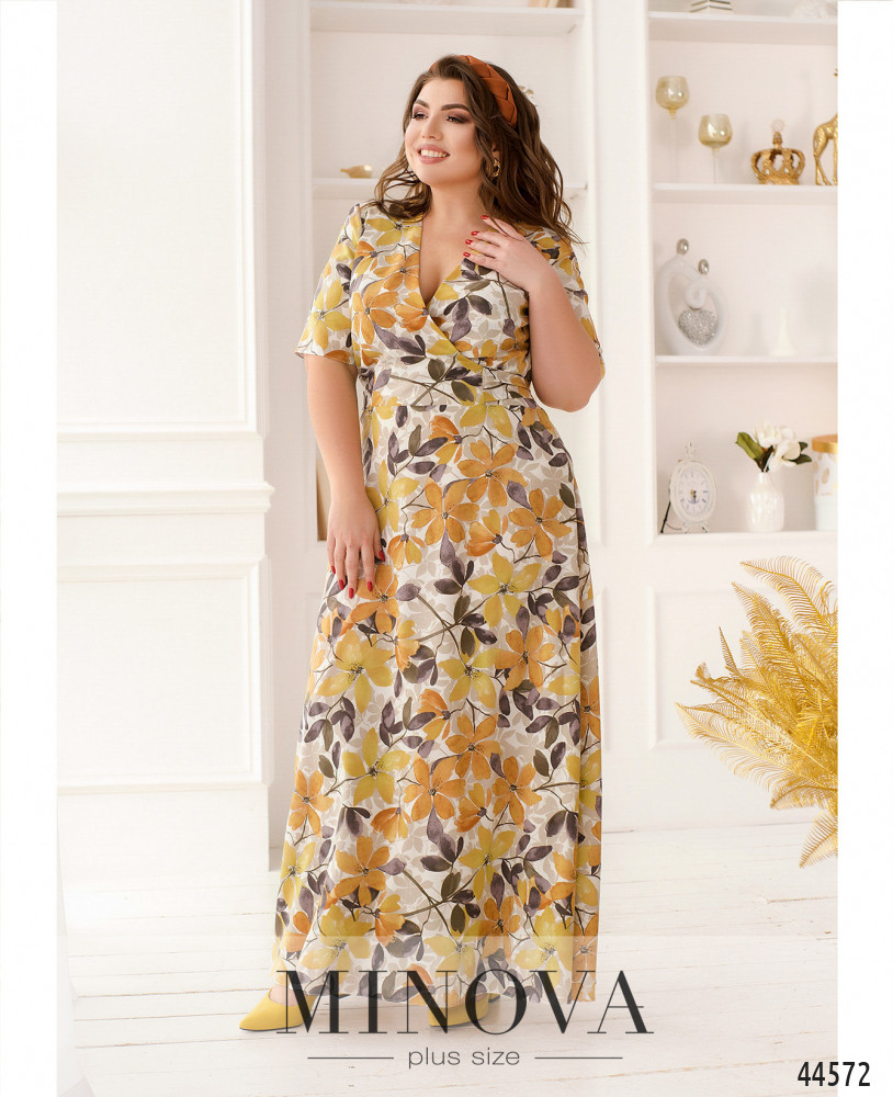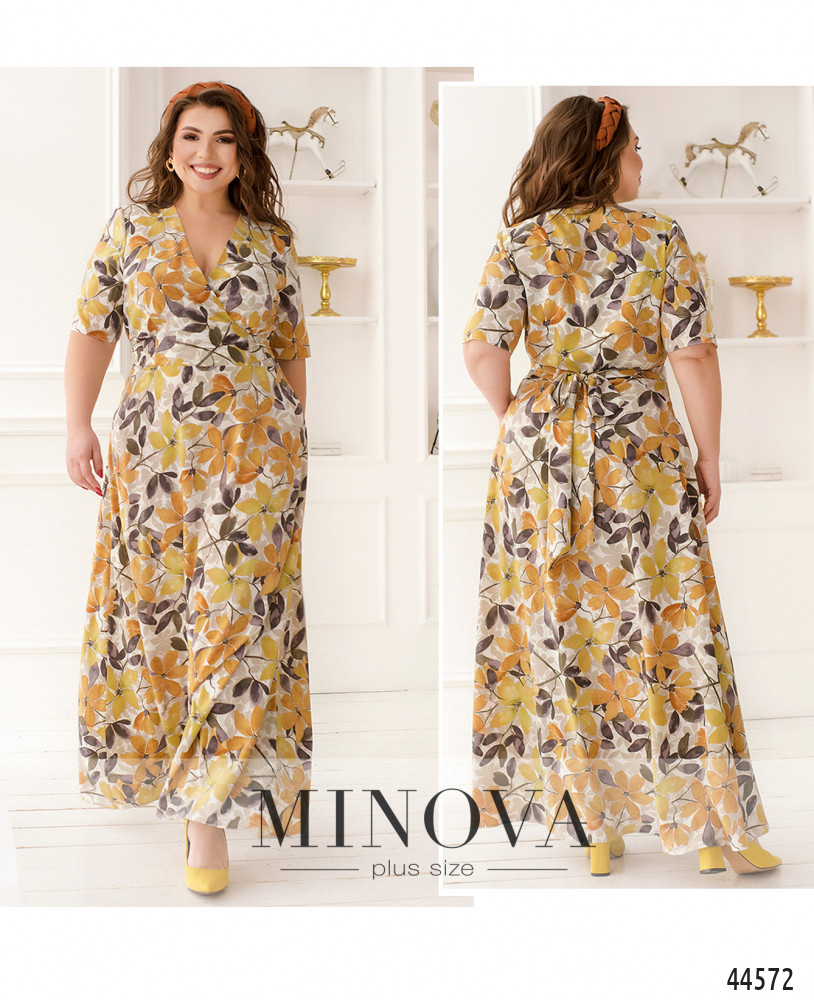 Элегантное и привлекательное платье плюс сайз с подшитым запАхом, подол расклешён. Рукава короткие, без манжет. Карманов нет. Застёжка - молния, вшитая слева. В наличии подшитый пояс.