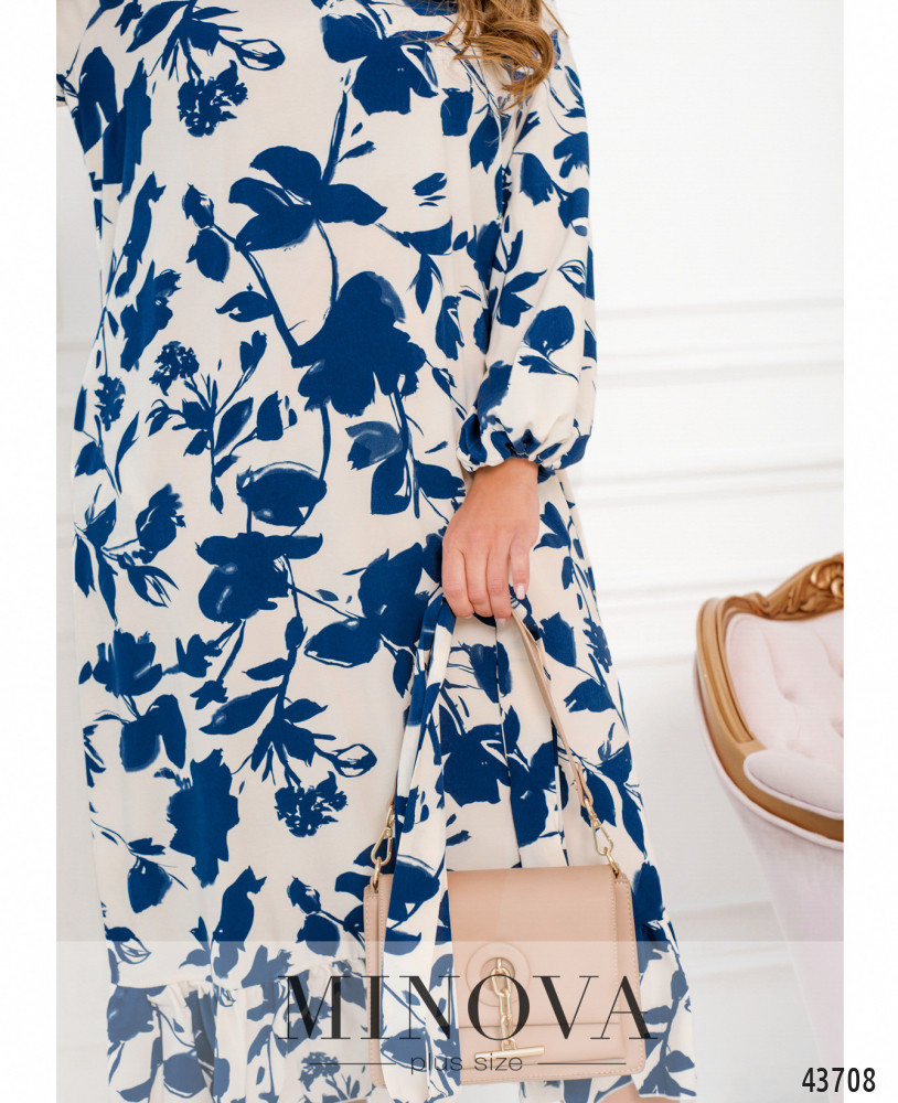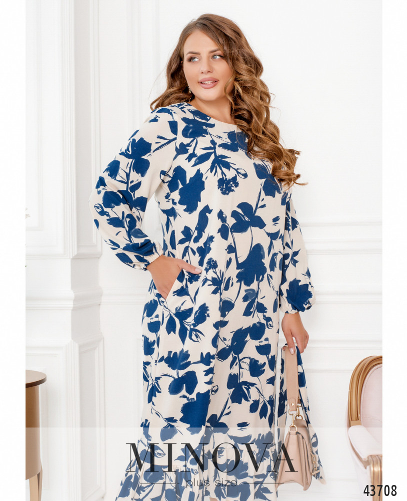 Стильное, женственное платье большого размера из ультрамягкой и практичной ткани софт. Платье с ярким принтом, цельнокроеное, декорировано по подолу оборкой, по бокам - врезные карманы. В рукава на запястьях вшиты манжеты, застёжка - пуговка сзади под шеей.