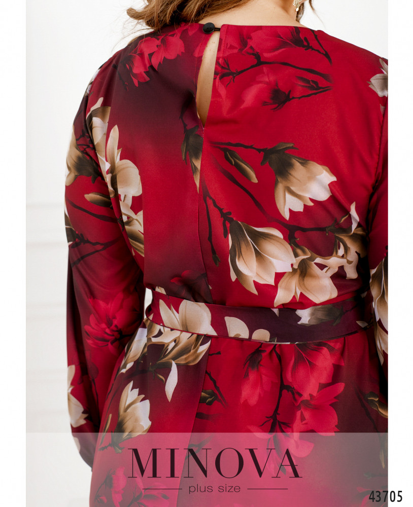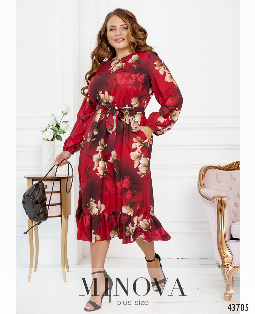 Стильное, женственное платье большого размера из ультрамягкой и практичной ткани софт. Платье с ярким принтом, цельнокроеное, декорировано по подолу оборкой, по бокам - врезные карманы. В рукава на запястьях вшиты манжеты, застёжка - пуговка сзади под шеей.