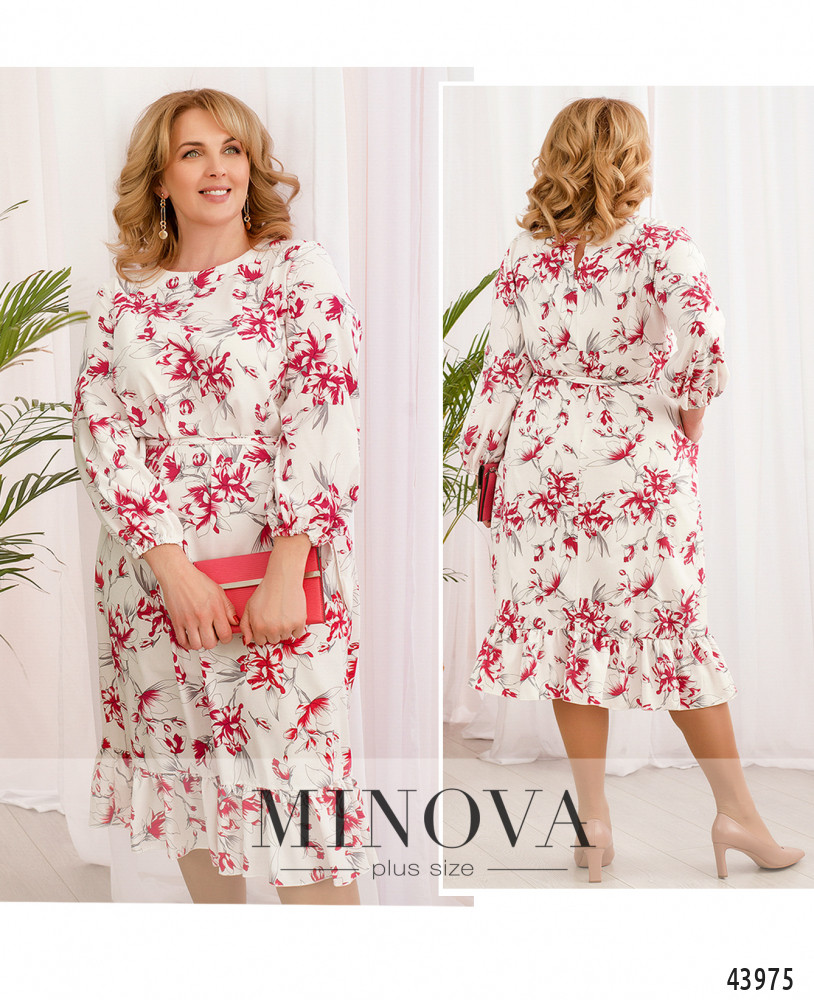 Нежное и романтичное платье батал, цельнокроеное, по бокам - карманы в шве. Подол украшен оборками, в рукава на запястьях вшиты резинки, ткань присобрана оборками на манжетах. Застёжка - пуговка сзади под шеей. В комплекте пояс в тон. Вырез горловины полукруглый.