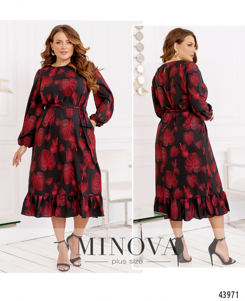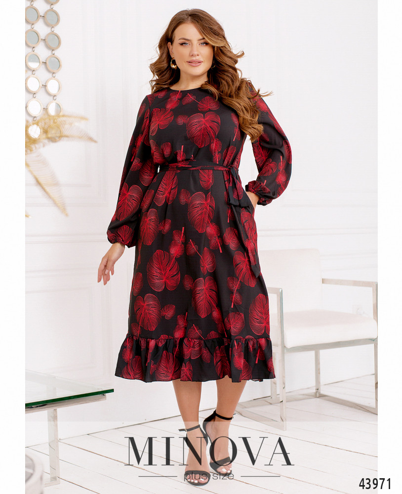 Нежное и романтичное платье батал, цельнокроеное, по бокам - карманы в шве. Подол украшен оборками, в рукава на запястьях вшиты резинки, ткань присобрана оборками на манжетах. Застёжка - пуговка сзади под шеей. В комплекте пояс в тон. Вырез горловины полукруглый.